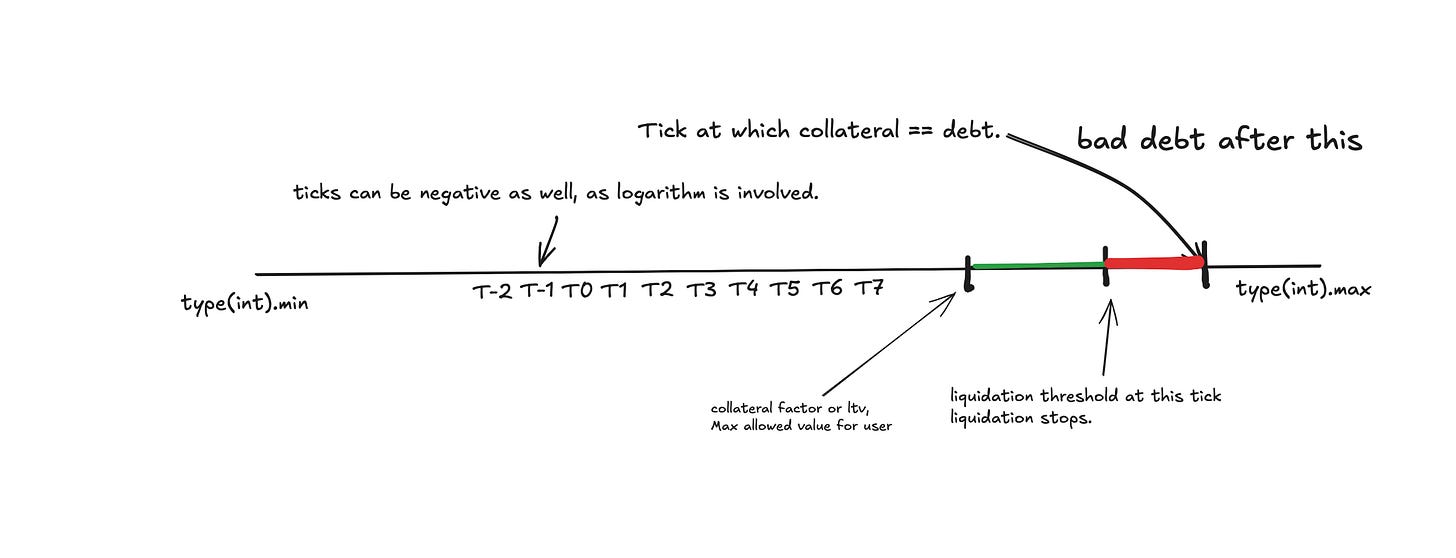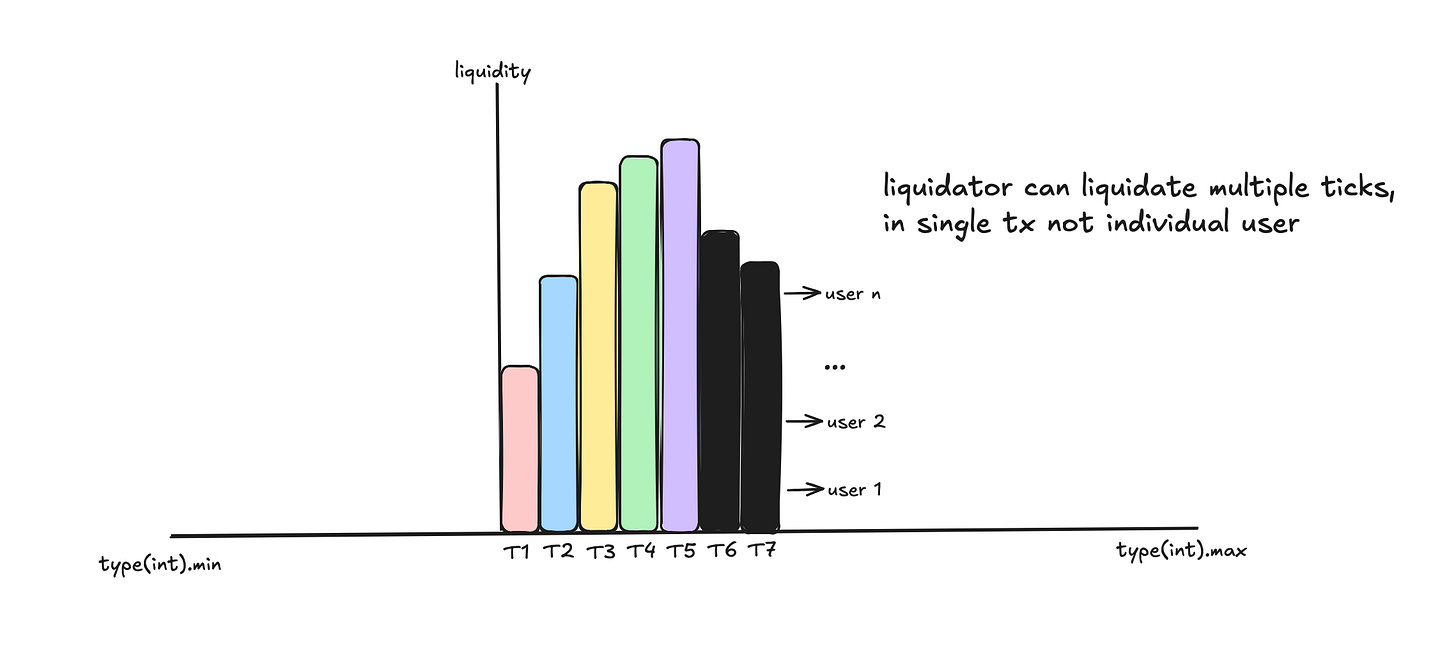 Liquidators can then step in and process these risky ticks in bulk. A single liquidation transaction can clear the accumulated debt across multiple user positions simultaneously, all grouped within the same tick. If additional liquidation is needed, the process continues flowing through successive ticks until the risky debt has been adequately processed or the liquidation amount is exhausted.