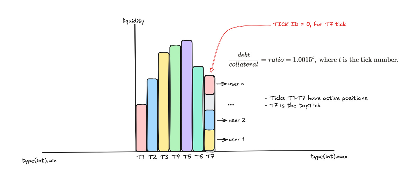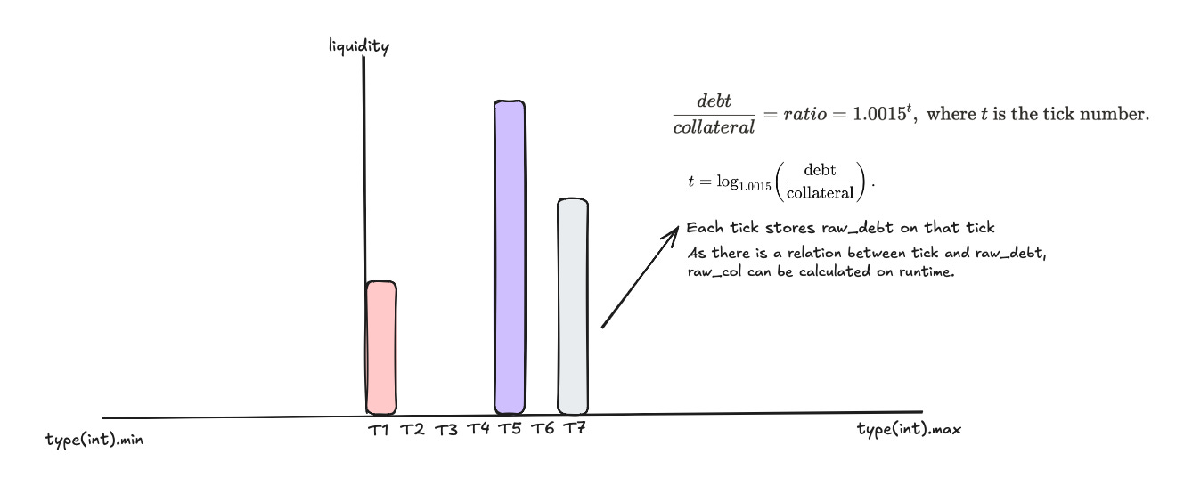 Within each tick, the protocol tracks the combined exposure of all positions at that risk level. If 10 users each have positions contributing to a specific tick, that tick accumulates the total debt and collateral characteristics of all ten positions together.